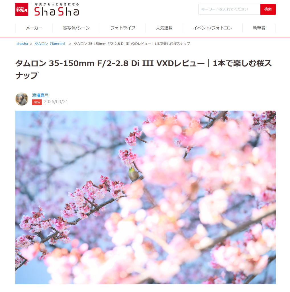 カメラのキタムラさんのコンテンツサイト「ShaSha(シャシャ)」で、レンズレビューを執筆しました。今回は、静岡県熱海市で撮影したあたみ桜と一緒に、タムロン 35-150mm F/2-2.8 Di III VXDを紹介。桜撮影のヒントもあわせてお伝えしました。